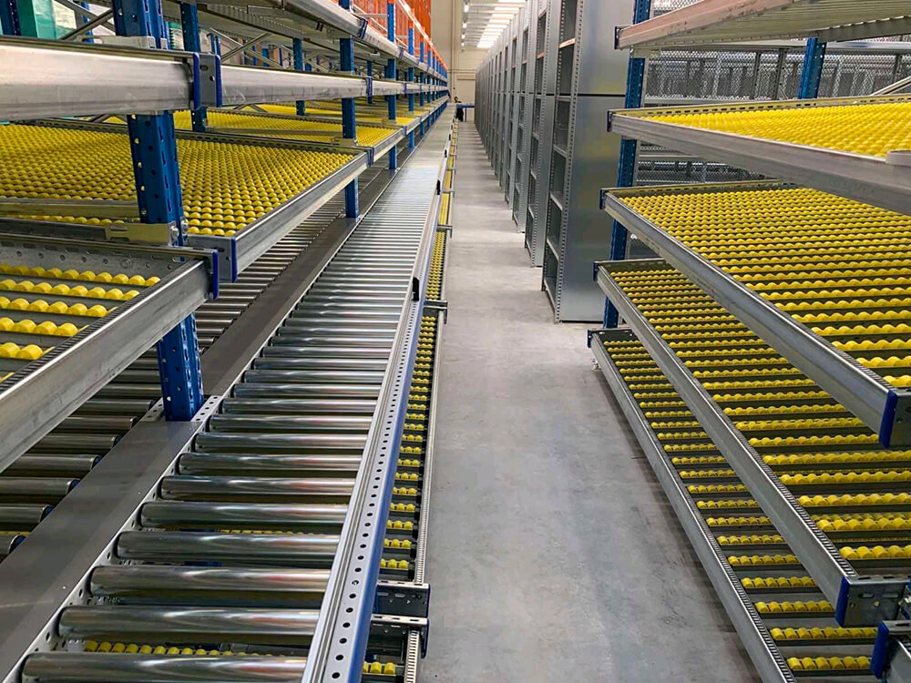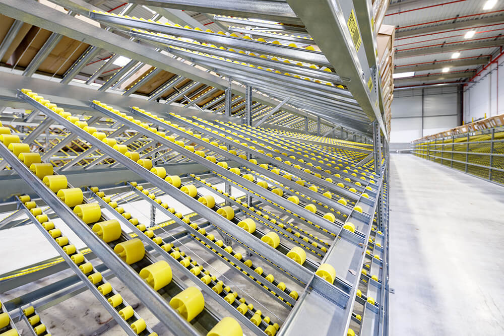 Estanterías cuyas plataformas están inclinadas y por medio de rodillos garantizan la óptima entrada y salida del material. Los productos se colocan desde uno de los extremos y gracias a la acción de la gravedad se deslizan hacia el extremo contrario. De esta forma se asegura una perfecta rotación de productos y se evita la interferencia en las tareas de picking y reposición, a su vez aumenta la velocidad general del proceso de picking. Los racks dinámicos de cajas reducen las distancias recorridas en el almacén y ahorra tiempo, se adapta de manera excelente en almacenes con alto volumen de pedidos con picking manual. Permite una adecuada gestión FIFO. El sistema Carton Live de Stow mejora la velocidad de recogida de pedidos y la productividad.