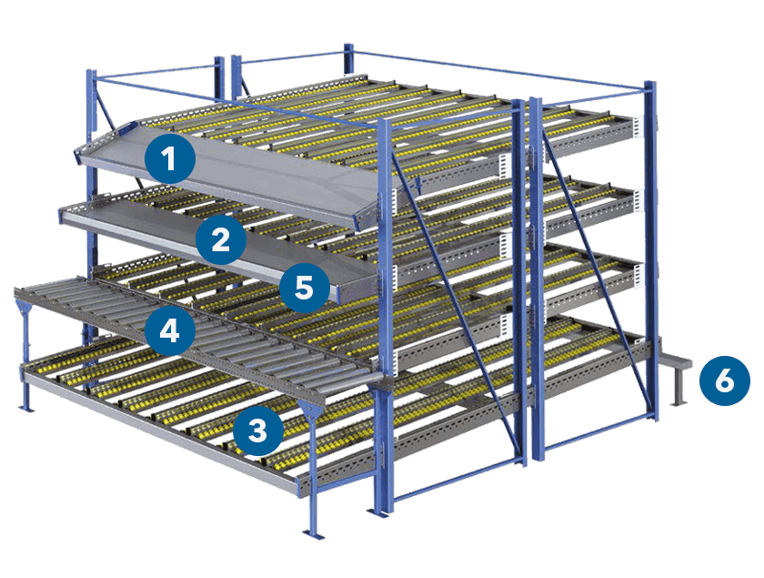 Estanterías cuyas plataformas están inclinadas y por medio de rodillos garantizan la óptima entrada y salida del material. Los productos se colocan desde uno de los extremos y gracias a la acción de la gravedad se deslizan hacia el extremo contrario. De esta forma se asegura una perfecta rotación de productos y se evita la interferencia en las tareas de picking y reposición, a su vez aumenta la velocidad general del proceso de picking. Los racks dinámicos de cajas reducen las distancias recorridas en el almacén y ahorra tiempo, se adapta de manera excelente en almacenes con alto volumen de pedidos con picking manual. Permite una adecuada gestión FIFO. El sistema Carton Live de Stow mejora la velocidad de recogida de pedidos y la productividad.